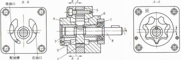 1— 外轉(zhuǎn)子:2—內(nèi)轉(zhuǎn)子:3—軸承:4—前蓋:5—泵體:6—后蓋:7—彈簧卡圈:8—泵軸