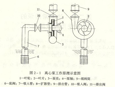 圖2—1是簡(jiǎn)化了的離心泵工藝系統(tǒng),它由離心泵、吸人和排出管、底閥、擴(kuò)散管等組成。離心泵主要由葉輪、葉片、泵殼、泵軸、填料筒等組成。