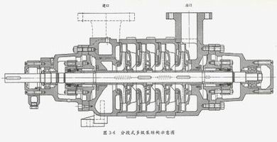 蝸殼式多級泵的結(jié)構(gòu)特點(圖3 5)一般采用中開式結(jié)構(gòu)以便于檢修,且有利于葉輪對稱布置,減,作用在轉(zhuǎn)子上的軸向力。但這種結(jié)構(gòu)的工藝性較差:級數(shù)越多,泵體和系蓋的形狀越復;.泵的外形尺寸越大,特別是級與級之間需要配置一些級間流道,使泵的外形比較復雜。