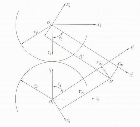 由圖1-10所示:若兩根互相嚙合的螺桿螺旋的節(jié)圓半徑分別為r和r 。螺桿1的固定坐標系為X1O1Y1,螺桿1的齒形曲線隨著動坐標系X1O1Y1轉動了O 角:螺桿2的固定坐標系為X2O2Y2轉動了O2角:由于兩相互嚙合的螺桿旋轉時轉向必定相反,故O1和O2 為反向:為便于討論,現(xiàn)將X'1O'1Y'1動坐標系中的任意點M(x'1,y'1)轉換到X1O1Y1固定坐標系,坐標系旋轉了O1角,即得。