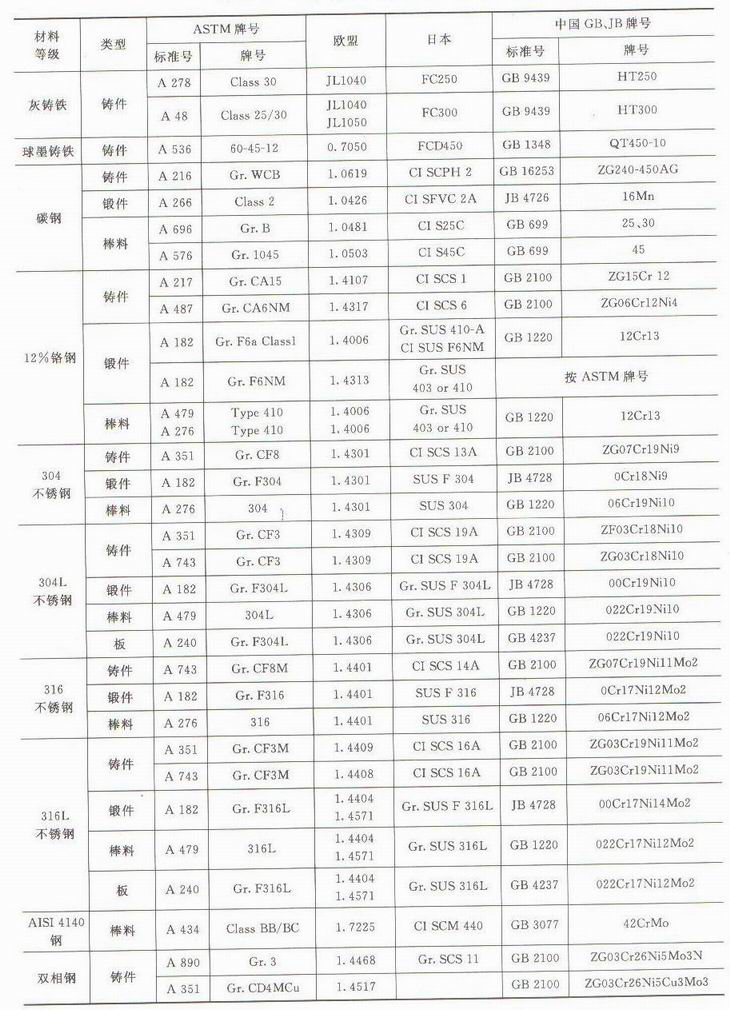 永嘉縣海坦牌泵常用材料牌號對照