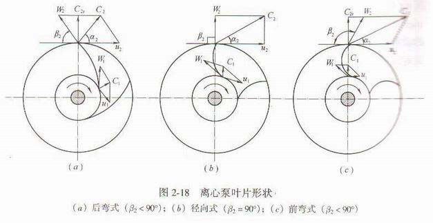 當(dāng)葉片出口是徑向時,B2=90.,如圖2-18(b)所示。當(dāng)B1和B2均小于90.時,葉片與旋轉(zhuǎn)方向呈后彎式葉片,如圖2-18(A)所示。當(dāng)B2大于90 。時,葉片與旋轉(zhuǎn)方向呈前彎葉片,如圖2-18(c)所示。因此,B2角的大小反映了葉片的彎度,是構(gòu)成葉片形狀和葉片能的一個重要數(shù)據(jù)。實際工程中使用的離心泵葉輪,