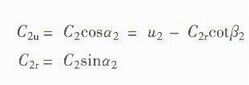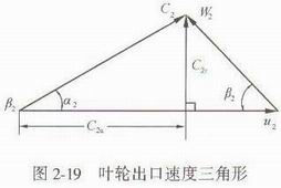在一下的討論中,我們均以后彎式葉片為對象來進行,并通常以速度三角形來代替速度平形四邊形,圖2-19所示為葉輪出口處速度三角形。圖中速度C2的切向分速用符號表示,徑向分速用符號C表示。