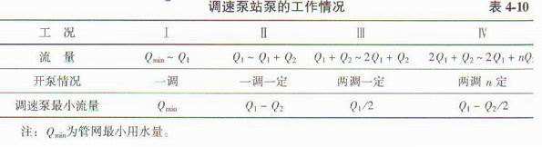 設(shè)有一送水泵站,己知*高日*大時供水量為Q,經(jīng)管網(wǎng)平差后相應(yīng)的泵站揚程為H ,現(xiàn)考慮變速時設(shè)計工況點流量為Q:選用定速泵n臺,其額定轉(zhuǎn)速時設(shè)計工況點流量為Q2。為適應(yīng)泵站工況點變化(流量的變化),泵的開啟情況見表4-10