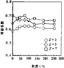圖4表示不同葉片數(shù)條件下,滑移系數(shù)隨粘度的變化關(guān)系曲線。由圖可見,滑移系數(shù)隨粘度的變化關(guān)系曲線取決于葉片數(shù)。當(dāng)葉片數(shù)較少(Z=3)時,滑移系數(shù)隨粘度增大而增加,直到粘度大于75cSt以后,略有減小,但都比輸送清水時的大。當(dāng)葉片數(shù)中等(Z=5)時,當(dāng)粘度在20~100cSt范圍內(nèi),滑移系數(shù)達(dá)到值,以后隨粘度增大而減小,接近輸送清水時的滑移系數(shù)值。當(dāng)葉片數(shù)較多(Z=7)時,滑移系數(shù)隨粘度增大而減小,比輸送清水時的小。圖5表示不同葉片數(shù)時相對滑移系數(shù)隨粘度的變化關(guān)系。相對滑移系數(shù)是指輸送粘油時的滑移系數(shù)與輸送清水時的滑移系數(shù)之比。該圖反映的變化規(guī)律與圖4完全一致。