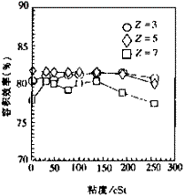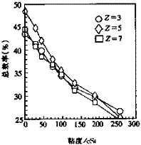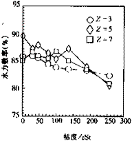 2.3 水力效率 圖6表示不同葉片數(shù)條件下水力效率隨粘度的變化關(guān)系。當(dāng)粘度低于200cSt時,Z=5葉輪水力效率比其它葉輪高;當(dāng)粘度高于200cSt時,Z=3葉輪比其它葉輪高。這種變化趨勢與泵總效率隨粘度的變化情況很一致,見圖9。