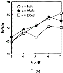 圖3(a)表示在粘度為1cSt(水)、98cSt(油)和255cSt(油)條件下,采用本文方法計算的滑移系數(shù)隨葉片數(shù)的變化曲線。圖3(b)為實驗測得的工況揚程。由圖可見,滑移系數(shù)隨葉片數(shù)的變化規(guī)律與揚程隨葉片數(shù)的變化規(guī)律完全一致,再次表明本文計算方法是合理的。總體上,輸送粘油時滑移系數(shù)與葉片數(shù)的關(guān)系基本還是線性的。