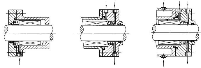 圖1--24沖洗冷卻機械密封裝置 圖1—25靜環(huán)背部引入冷卻水 圖1—26密封腔外加冷卻水套