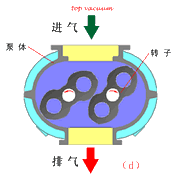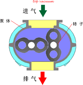 羅茨泵的結(jié)構(gòu)如圖所示。在泵腔內(nèi),有二個“8”字形的轉(zhuǎn)子相互垂直地安裝在一對平行軸上,由傳動比為1的一對齒輪帶動作彼此反向的同步旋轉(zhuǎn)運動。在轉(zhuǎn)子之間,轉(zhuǎn)子與泵殼內(nèi)壁之間,保持有一定的間隙,可以實現(xiàn)高轉(zhuǎn)速運行。由于羅茨泵是一種無內(nèi)壓縮的真空泵,通常壓縮比很低,故高、中真空泵需要前級泵。