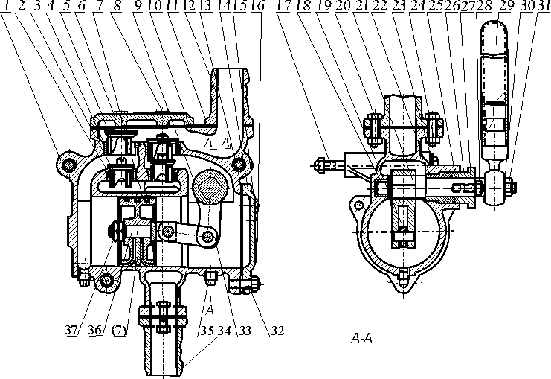 S、SH-25、38型手搖泵的結構原理是,當用手往復搖動搖手柄(29)時,通過軸(21)、搖臂(9)、連桿(36)等傳動機構,使活塞(7)作往復運動。如圖所示,當活塞向左移動時,右端的泵缸體積逐漸擴大,形成真空,液體從吸水管(34)經(jīng)過鑄在泵體旁邊的吸入流道頂開吸水閥進入缸體右端。在同一時間里,缸體左側由于活塞的壓縮,使壓水閥(5)頂開,液體經(jīng)吐出管(11)排出。若活塞的運動方向返回向右時,則泵缸左側吸入液體,泵缸右側排出液體,這樣往復不歇地把液體吸入排出。形成泵的工作。泵的壓水閥向上行程由蓋板(6)限止,吸水閥向上行程由壓水閥限止。蓋板與泵體用螺栓(8)緊固,活塞行程由泵蓋(14)和泵體限止。